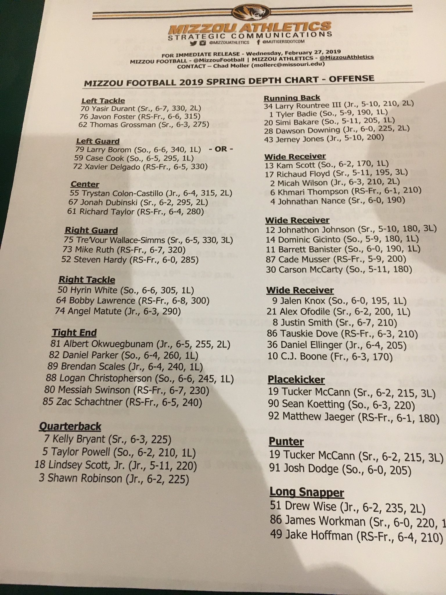 Missouri Releases Depth Chart For Season Opener At Wyoming